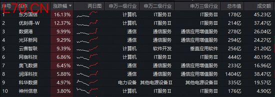 成份股方面,数据港涨停,东方国信领涨超16%,优刻得-W涨逾12%,光环新网、云赛智联涨超9%,网宿科技、奥飞数据、润泽科技等个股跟涨。