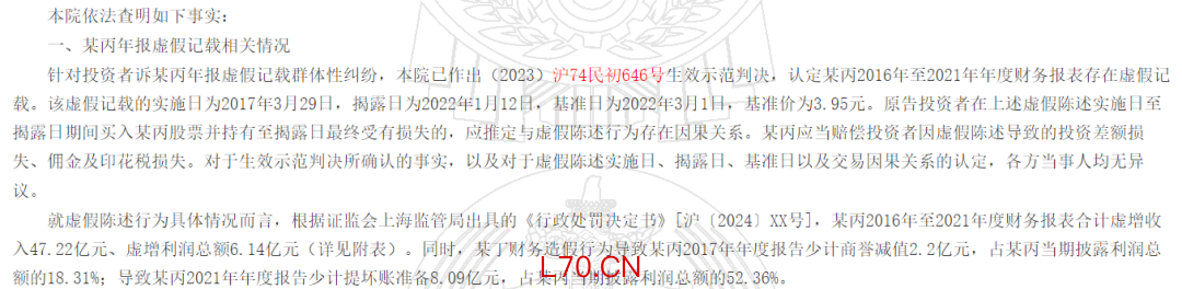 根据判决文书透露,针对投资者诉某丙年报虚假记载群体性纠纷,上海金融法院已作出(2023)沪74民初646号生效示范判决,认定某丙2016年至2021年年度财务报表存在虚假记载。该虚假记载的实施日为2017年3月29日,揭露日为2022年1月12日,基准日为2022年3月1日,基准价为3.95元。原告投资者在上述虚假陈述实施日至揭露日期间买入某丙股票并持有至揭露日最终受有损失的,应推定与虚假陈述行为存在因果关系。某丙应当赔偿投资者因虚假陈述导致的投资差额损失、佣金及印花税损失。