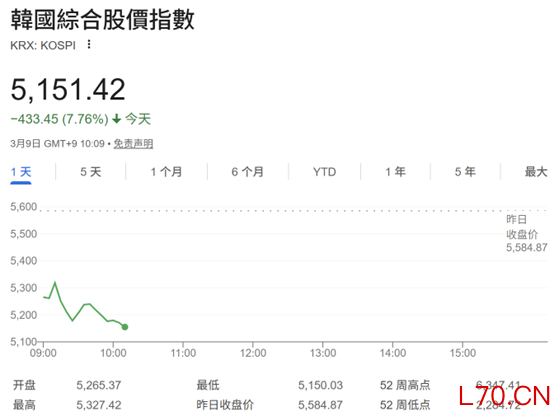 韩国KOSPI指数开盘下跌5.7%,截至发稿,跌幅扩大至7.7%。