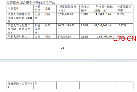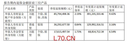 与此同时,据华泰人寿保险股份有限公司二〇二五年四季度偿付能力报告摘要,报告期内,退保金额居前三位的产品,分别为华泰人寿财富金账户年金保险(万能型),年度累计退保率为9.42%,年度累计退保规模为39123.53万元;华泰人寿传家宝终身寿险,年度累计退保率为3.16%,年度累计退保规模为12999.23万元;华泰人寿金管家终身寿险(万能型),年度累计退保率为6.54%,年度累计退保规模为6881.47万元。