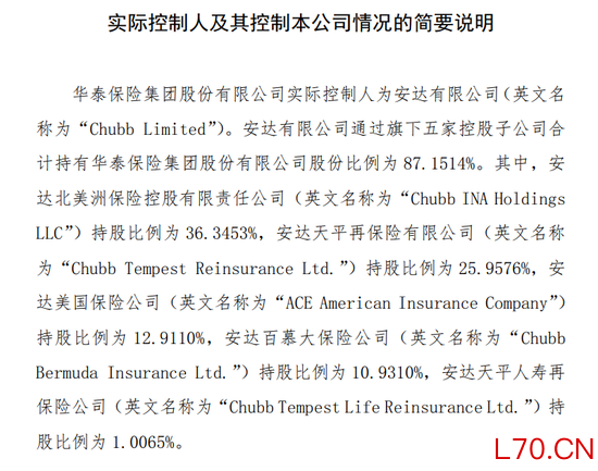 华泰保险集团官网披露的《实际控制人及其控制本公司情况的简要说明》显示,安达有限公司通过5家子公司合计持有华泰保险集团87.1514%股份,其中安达北美洲保险控股有限责任公司持股36.3453%,安达天平再保险有限公司25.9576%,安达美国保险公司12.9110%,安达百慕大保险公司10.9310%,安达天平人寿再保险公司1.0065%。