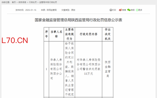 而若切换为监管这一与退保完全不同的视角,则可以看到,其部分地方分支机构在2025年至2026年间出现了因销售及管理等环节不合规而被处罚的情形。从监管处罚情况看,2026年1月16日,《国家金融监督管理总局陕西监管局行政处罚信息公示表》显示,华泰人寿保险股份有限公司陕西分公司,因“给予投保人保险合同约定以外利益、欺骗投保人、销售人员执业登记管理不规范”,陕西金融监管局对其予以警告并处罚款15万元。