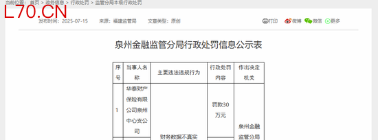 财险方面,2025年7月15日,《泉州金融监管分局行政处罚信息公示表》显示,华泰财产保险有限公司泉州中心支公司因“财务数据不真实”,泉州金融监管分局对其予以罚款30万元。