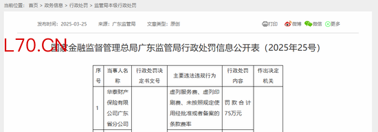 在此之前的2025年3月25日,《国家金融监督管理总局广东监管局行政处罚信息公开表(2025年25号)》显示,华泰财产保险有限公司广东省分公司,因“虚列服务费、虚列印刷费、未按照规定使用经批准或者备案的条款费率”,国家金融监督管理总局广东监管局对其予以罚款合计75万元。
