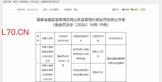 2026年3月3日,《国家金融监督管理总局山东监管局行政处罚信息公开表(鲁金罚决字〔2026〕16号-19号)》显示,华泰人寿保险股份有限公司山东分公司因“给予投保人保险合同约定以外的其他利益”、华泰人寿保险股份有限公司济南中心支公司因“未经批准变更分支机构营业场所”,国家金融监督管理总局山东监管局分别对其予以罚款11.5万元、4万元。