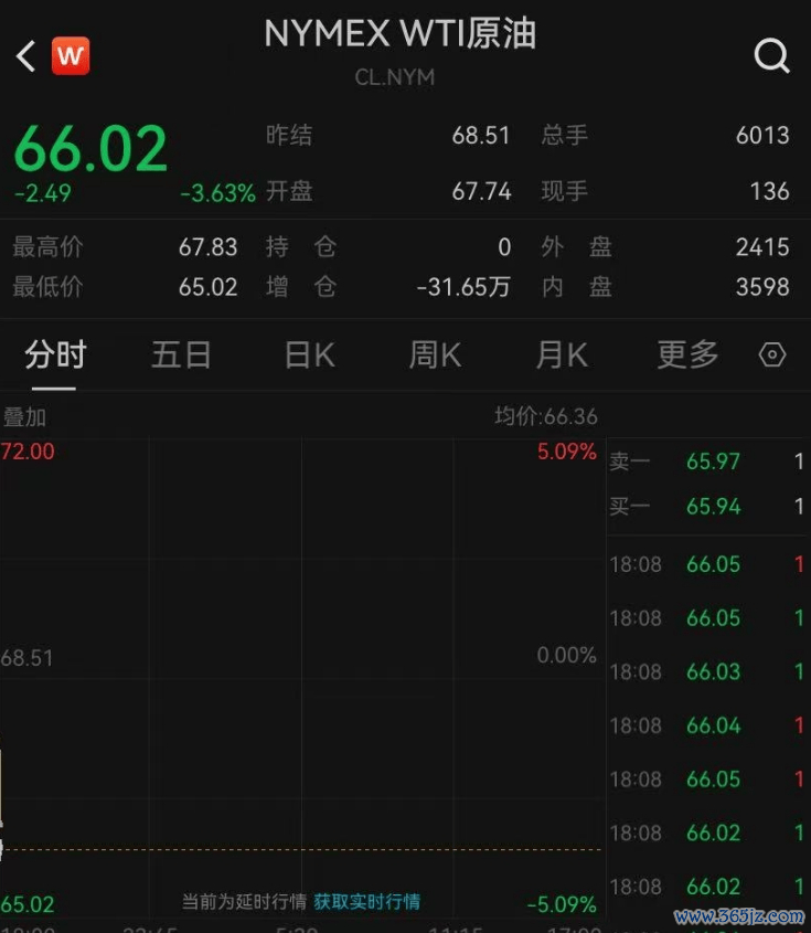 受此影响,国际油价大幅走低,美国WTI原油期货亚市盘初一度跌逾5%,截至发稿,跌幅收窄至3.63%,报66.02美元/桶。